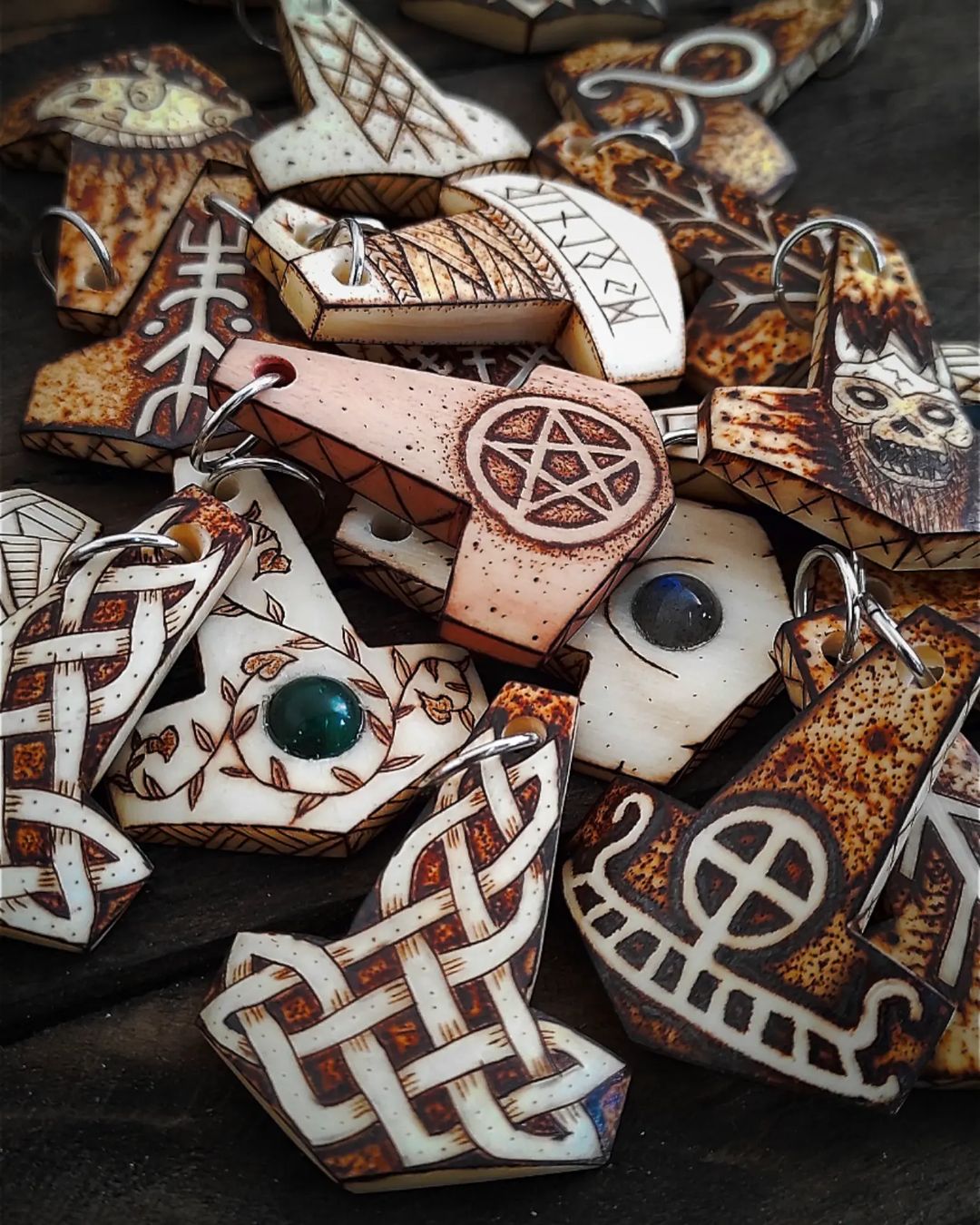 My personal take on the great trickster God Loki, carved from buffalo bone and forged under the flame of pyrography.